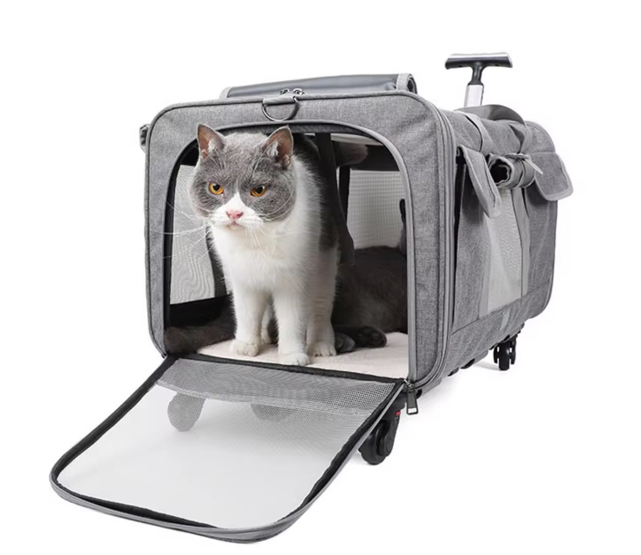 ترولي حمل پت، مخصوص كسايي كه دوتا پت كوچك دارند يا يه پت بزرگ تحمل وزنش ١٢ كيلو ، كه هم به صورت دو قسمت مجزا ميشه و هم ديواره وسطت جدا ميشه ،قابل استفاده به صورت سافت باکس ساده و با ترولی